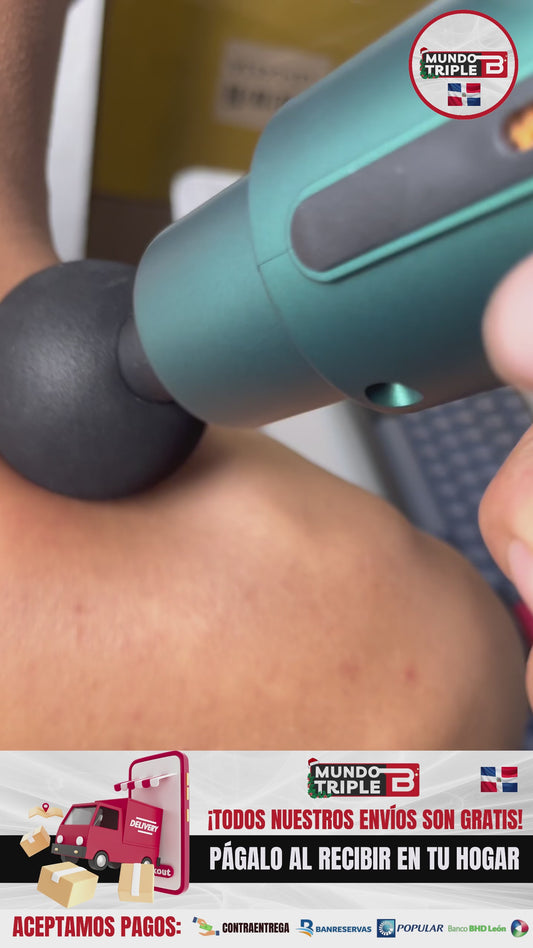 PISTOLA DE MASAJE RECARGABLE PROFESIONAL CON 4 CABEZAS INTERCAMBIABLES Y 6 NIVELES DE INTENSIDAD