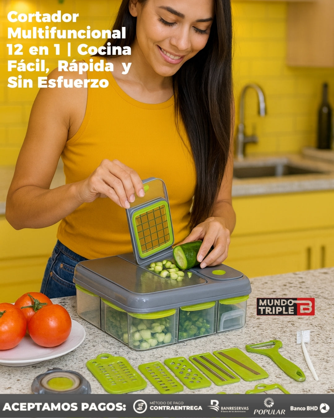 Incluye 12 accesorios entre cuchillas, ralladores, rebanadores, pelador y exprimidor.