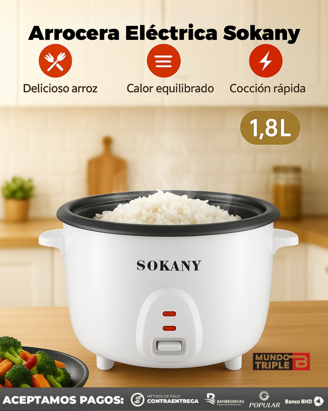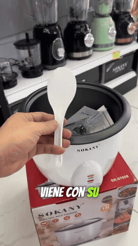 Con la Arrocera Eléctrica Sokany 1.8L tendrás arroz perfecto, suelto y caliente siempre 🍚🔥. Ideal para 4 a 6 porciones, con función automática de mantener caliente y recipiente antiadherente fácil de limpiar.